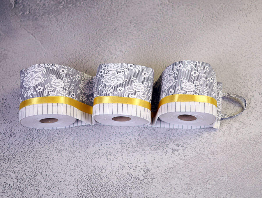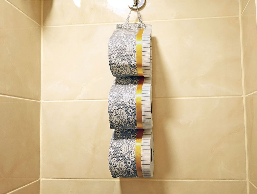 Create a classy look for your bathroom with the three-roll toilet paper holder with its classic French toile print and subtle band of ribbon stitched into the design. It’s also super easy to make.
