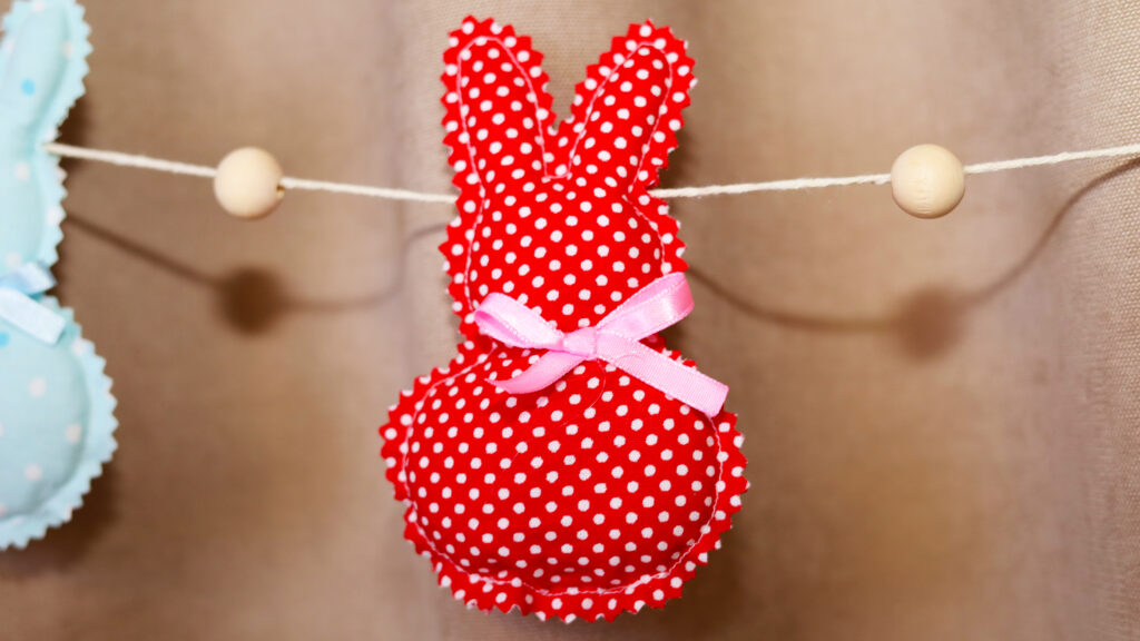 Stringing the garland: Thread the first bead, then take one of the bunnies and push your needle from side to side at the base of the ears. Leave about 8-10cm (3-4″) between them