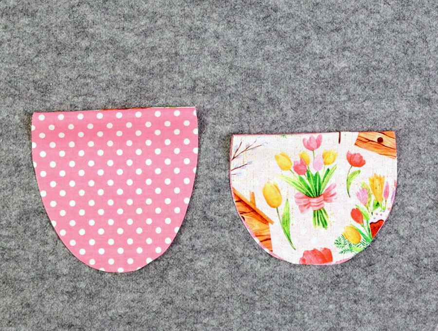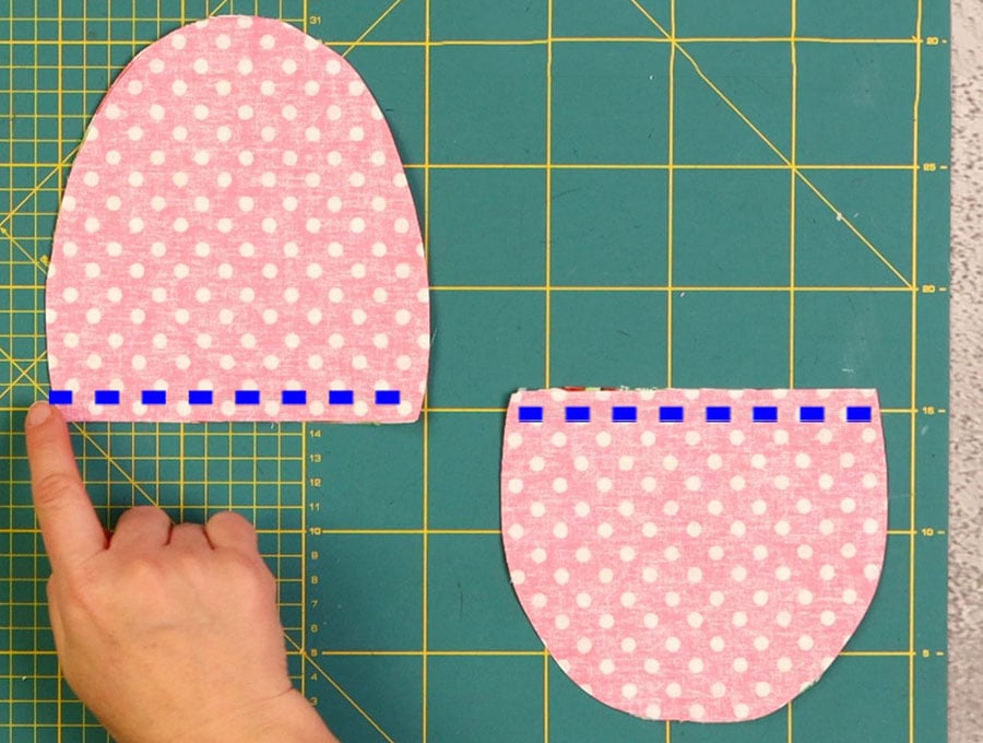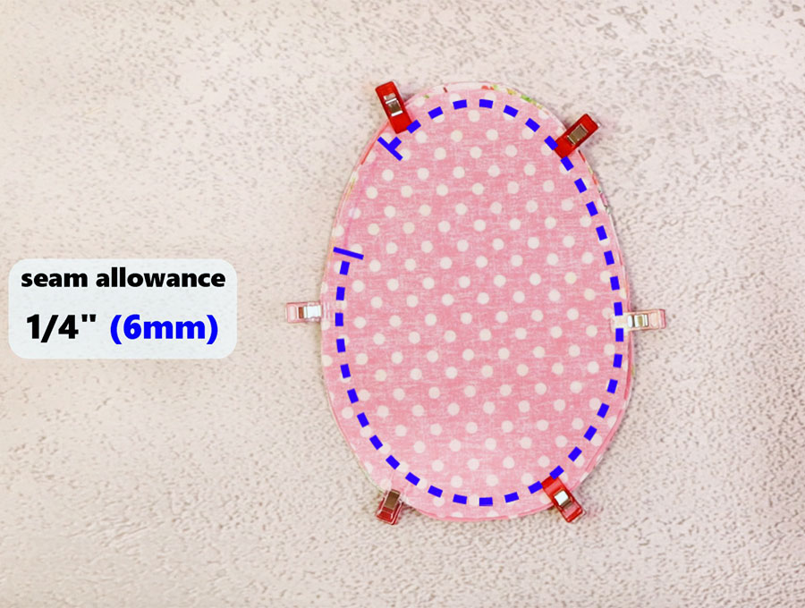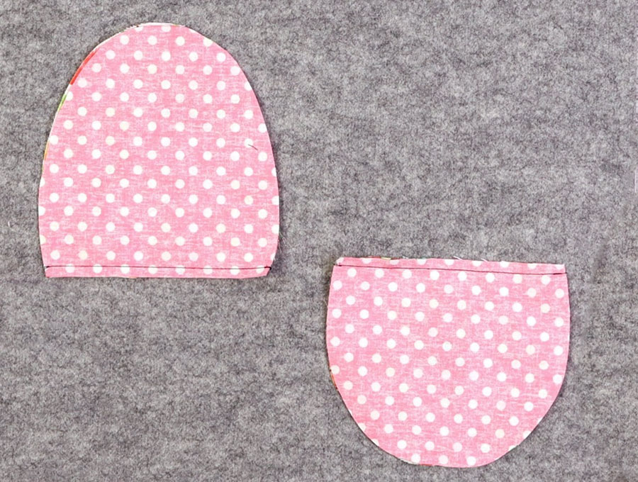 After cutting take the 2 pieces for the top of the egg, place them right sides together and stitch along the straight side ¼ inch (6 mm) from the edge. Repeat for the bottom of the egg