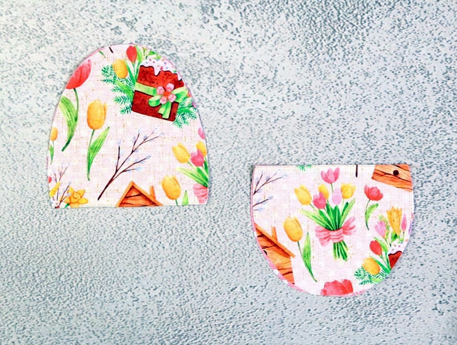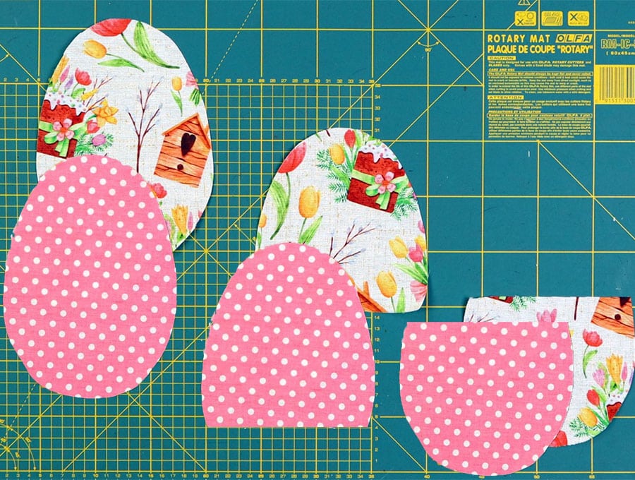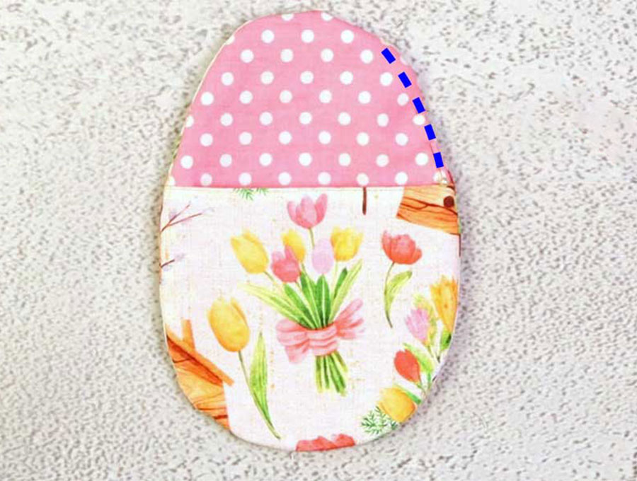 - Top of egg with lining side facing the outer fabric, and overlapping the bottom piece, lined up with whole egg shape