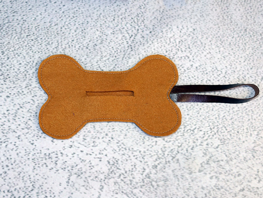Take the leather strip and fold it in half. Place the raw edges of the strip between the two layers of felt at the center of the short right side of the dog bone. Use pins or clips to secure.