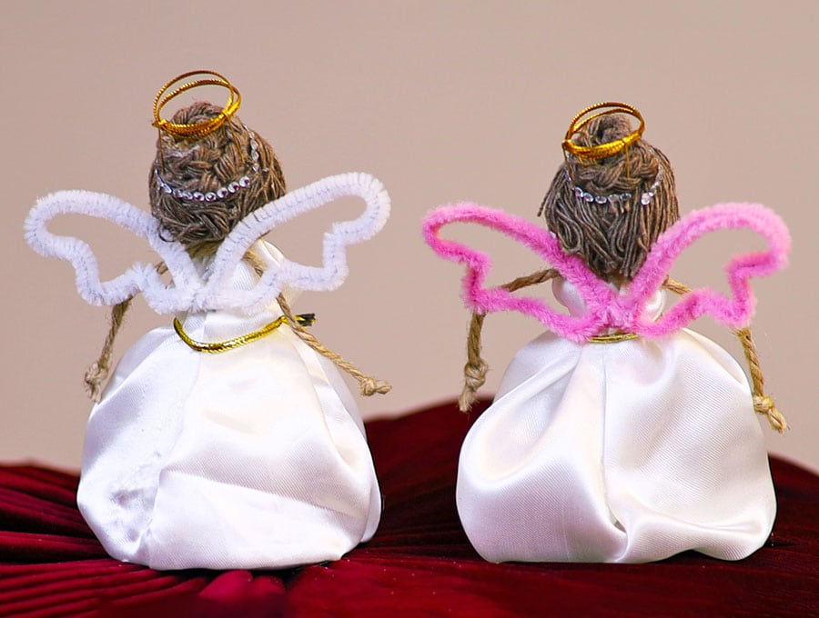 Make the angel wings from white, gold or silver chenille stems (aka pipe cleaners) bending them into a pair of angel wings – the actual shape is up to you – deep and dramatic like an archangel or shallower like butterfly wings. Twist the ends so the wings are attached to each other.