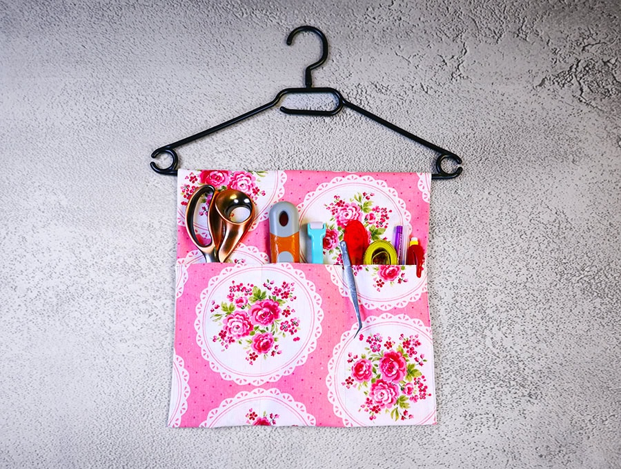 If you have been subjected to bellows of “Where are the scissors?” or “I can’t find a screwdriver!” followed by the sound of slamming drawers then you need to make this tool hanger holder. It will save hours of frustration rummaging around for tools you need on a daily basis whether in your kitchen, kid’s homework area, sewing or craft room. It keeps tools together and if fastened inside a cupboard door they are out of sight yet readily available. All it needs is around 15 minutes of your time, two bits of fabric, a clothes hanger and your sewing machine. It’s as easy as that.